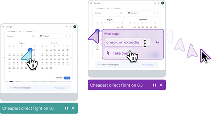 最后,用户可以便捷地在每个页面中部署调度不同的智能体以完成情境下的任务。每个智能体通过不同颜色的虚拟光标来显示,以方便用户追踪和查看。