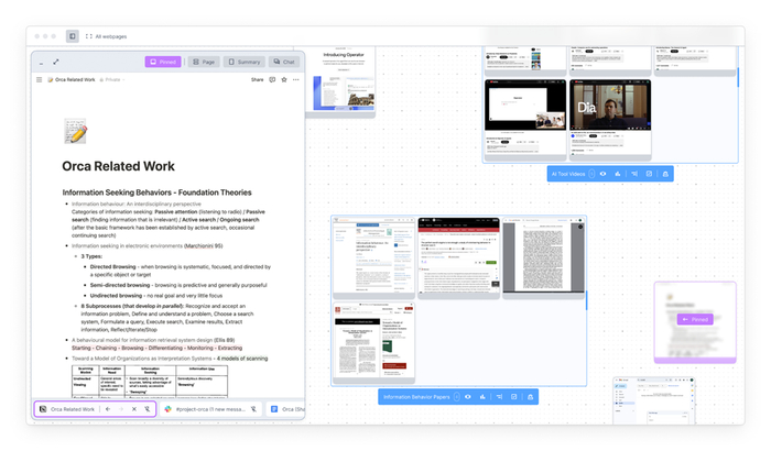 Orca提供一个空间化的网页画布:把多个网页当成可拖拽/缩放的对象,就像在Figma里排版。用户可并排对照、按任务分簇,随探索范围扩大而能够在缩放中纵览全局。