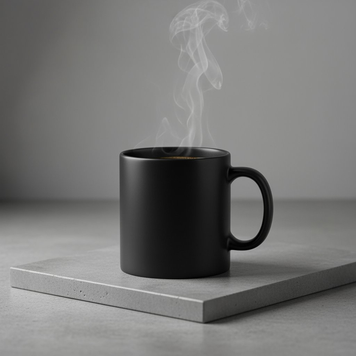一张高分辨率、影棚布光的产品照:一只极简风的消光黑陶瓷咖啡杯,摆放在抛光的混凝土表面上。灯光为三点柔光箱布光,营造柔和的高光并消除硬阴影。机位为略抬高的 45 度角,凸显其干净的线条。超写实,对咖啡升起的蒸汽进行锐利对焦。方形图像。