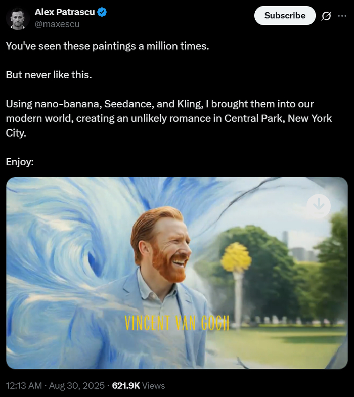 有人脑洞大开,让nano banana、Seedance、Kling联手,将梵高和蒙娜丽莎、戴珍珠耳环的少女等名画的人物,同时带到了今天的纽约中央公园里,开启了一段浪漫的邂逅。