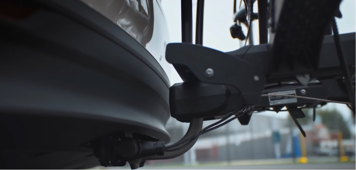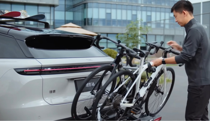 定制层面,理想和知名户外品牌YAKIMA合作了一款原厂自行车架,可以装载两个全尺寸的自行车,另外和车机内也做了深度的绑定,所有的信号灯都可以和车辆完全同步,车机也可以实时看到这个自行车架的状态: