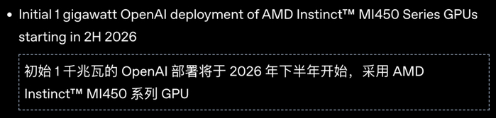 此次合作的GPU采用AMD Instinct MI450系列,初始1GW将于2026年下半年开始。