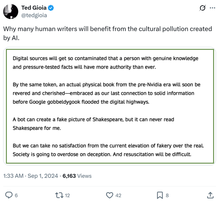 Ted Gioia,知名音乐评论家,也提出AI无法替代人类在创作中的深度思考与情感表达。