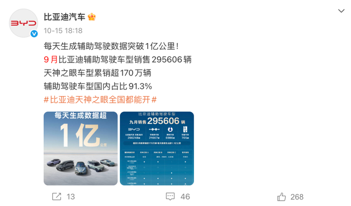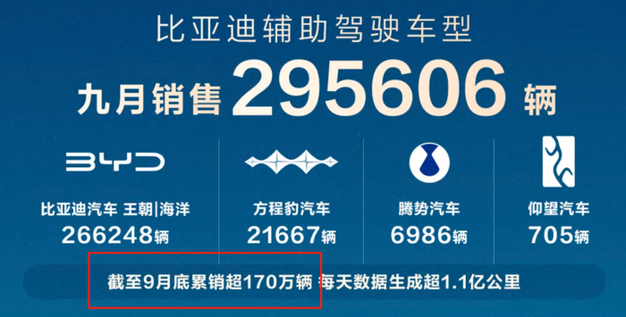 众所周知,比亚迪今年重点发力智能辅助驾驶,最近每个月接连公布进度条,今年5月的渗透率已达75%,此后节节攀升,9月渗透率甚至突破了91.3%,每日生成辅助驾驶数据1.1亿公里。