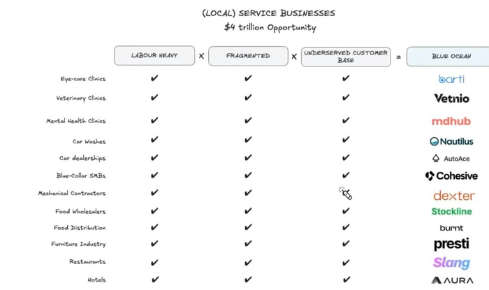 Ben 分析后发现,符合这个公式的最大机会集中在本地服务业务(local service businesses)。这是一个 4 万亿美元的市场,几乎完全没有被 SaaS 触及过。这些业务劳动力密集、极度碎片化,很多细分领域的潜在客户不到 3 万家。而且这些市场通常还没有主流的软件系统,他们的技术栈非常零散,依赖过时的软件,几乎没有任何一家在 AI 方面做过任何事情。