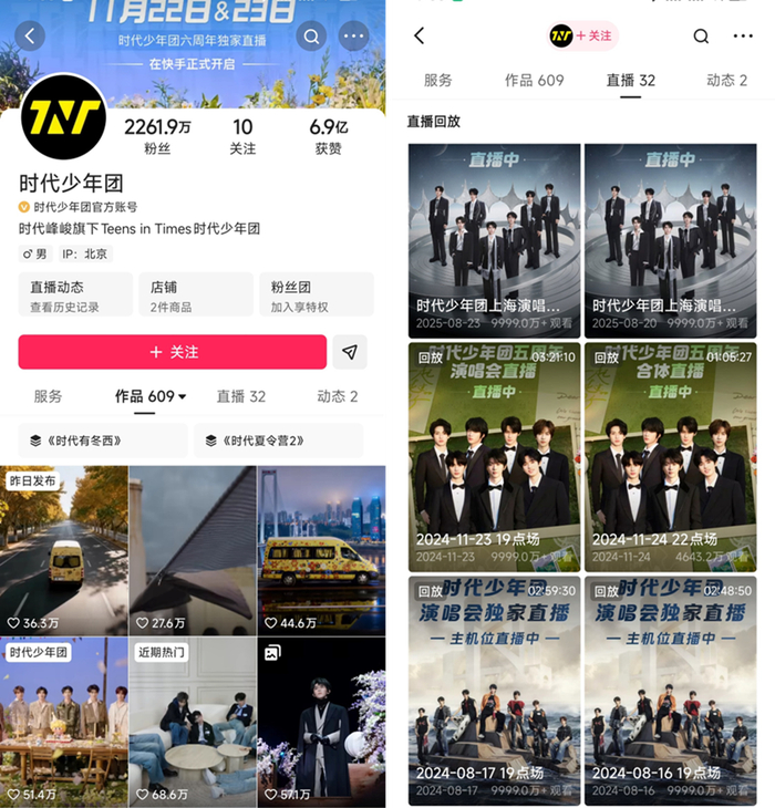 截至目前,时代少年团组合账号已在快手发布六百余条短视频作品,工作和训练之余还开启三十余场直播,吸引超过2260万快手老铁关注。与此同时,鲜活的时代少年团成员们也在个人账号上更新日常、分享心情、积极互动,流露出内娱极为稀缺的“活人感”,组合累计粉丝也超过7300万。