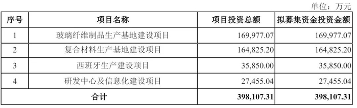 振石股份计划募资39.81亿元,其中,17亿元用于玻璃纤维制品生产基地建设项目,16.48亿元用于复合材料生产基地建设项目,3.59亿元用于西班牙生产建设项目,2.75亿元用于研发中心及信息化建设项目。