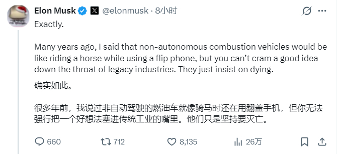 马斯克当时还出言嘲讽福特,认为这是“自作孽不可活”。因为在自动驾驶时代,内燃机的运营成本将完全不可持续。
