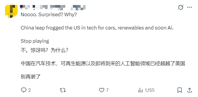 在辟谣之后,也有网友感到遗憾或不解,认为中国在汽车技术、可再生能源等已经超越了美国: