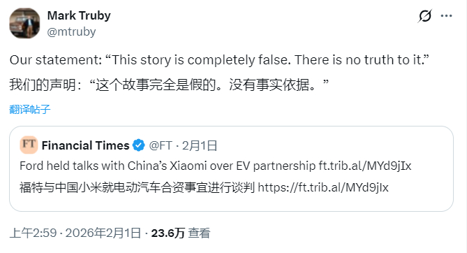 福特方面表示,“这个报道完全是假的,毫无事实根据。”福特汽车首席通信官马克·特鲁比(Mark Truby),也在社交平台发帖辟谣。