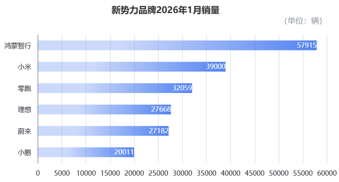 紧随其后的是小米汽车,1月交付量超39000台,与问界仅有一千台左右的差距。