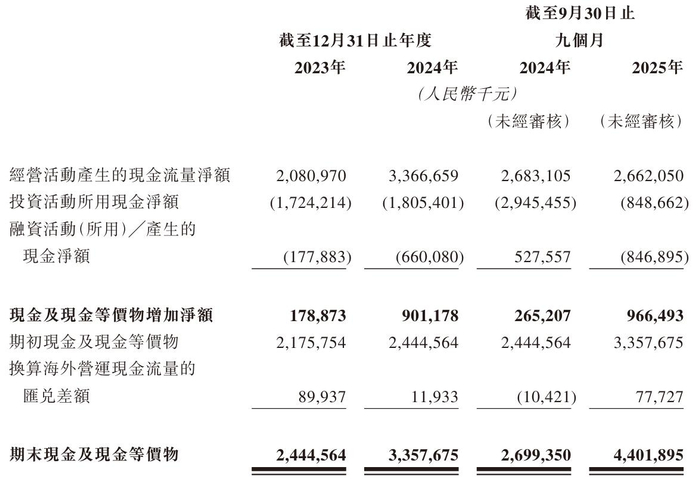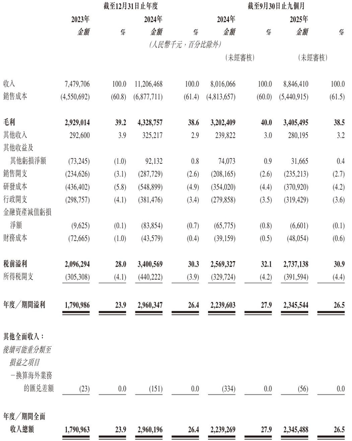 德业股份2025年前9个月营收为88.46亿元,毛利为34亿元,期内利润为23.46亿元,期内利润率为26.5%。
