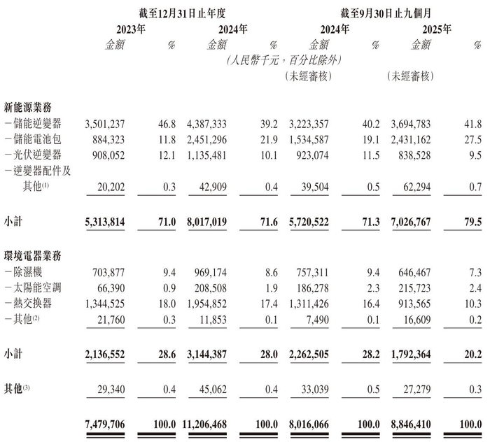 德业股份2025年前9个月来自储能逆变器收入为36.95亿,占比为41.8%;来自储能电池包收入为24.31亿元,占比为27.5%;来自光伏逆变器收入为8.39亿元,占比为9.5%。