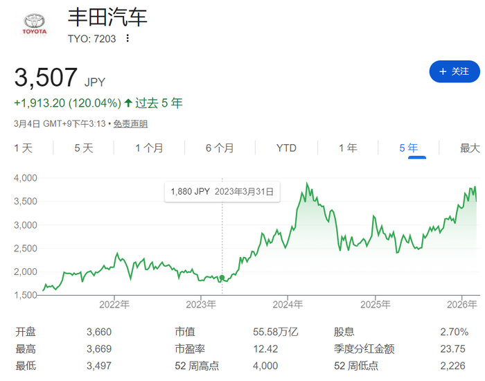 在他执掌的三年里,丰田连续两年全球销量突破千万辆,股价增长了超80%。