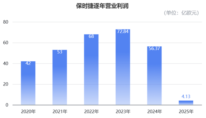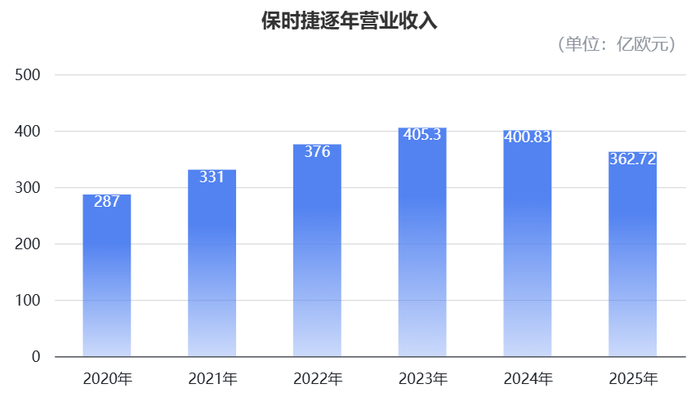 2025年,保时捷全年营业收入为362.7亿欧元(约2878.8亿元),同比下滑9.5%。