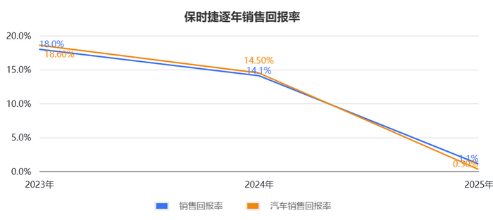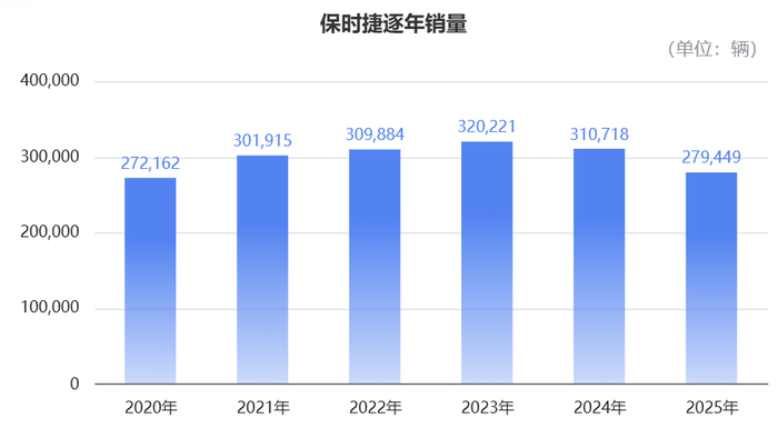 2025年,保时捷全球汽车交付量为27.9万辆,同比下降10%,已经连续两年下滑,回到五年前的水平。