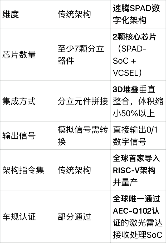 速腾的突破在于,将SPAD接收面阵与数据处理SoC通过3D堆叠工艺集成在一颗芯片上,实现“光电算”一体化: