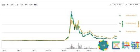 目前市值27亿,排名28,总发行量1.33亿,流通率100%。价格一直平稳,17年底到今年5月有暴涨暴跌情况,最近涨了4倍,从5块左右涨到了20块左右。