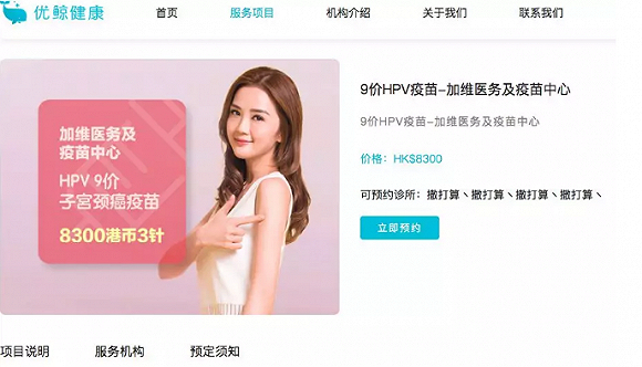 官方网站显示,优鲸健康是一家总部位于香港的跨境医疗与健康服务机构,目前已服务过30000位用户,跟50家顶级医疗机构建立了合作。可预约9九价HPV疫苗的诊所包括悦仁医疗、脊骨神经科医疗中心、美兆健检、环亚体检集团佐敦店、观塘店等13家。被查封的加维医务及疫苗中心也在其中。9价HPV疫苗标价8300港币。