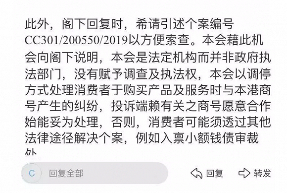 ▲ 一名内地消费者向香港消费者委员会发送维权投诉邮件后收到的回复与建议。(消费者供图)