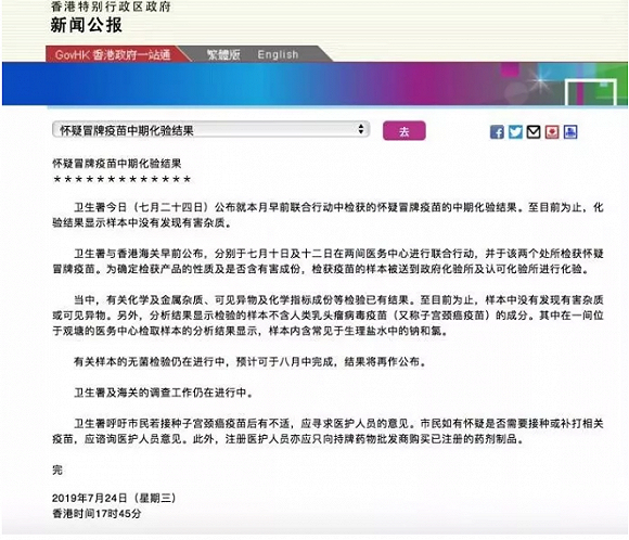 2019年7月24日,香港卫生署公布的怀疑冒牌疫苗中期化验结果显示,检验样本不含人类乳头瘤病毒疫苗(又称宫颈癌疫苗)的成分。