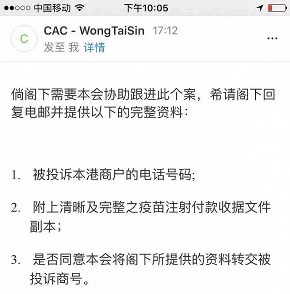 除与中介交涉外,维权者还在向香港消费者委员会提出维权,该机构要求消费者提交:被投诉本港商户的电话号码;附上清晰及完整之疫苗注射付款收据文件副本;要求的解决方案等。