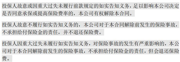 另外要强调的就是“如实”告知。不如实告知,后果很严重,甚至会在申请理赔时因为被发现没有如实告知,而被拒赔并被解除合同。每个公司的重疾险条款,基本都会有以下类似的表述。
