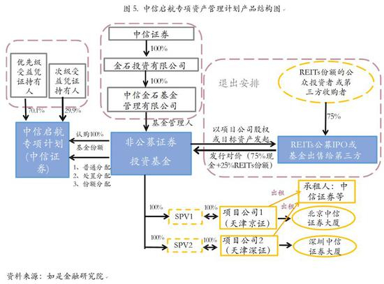 而规范的金融产品,尽管其结构设计较为复杂,却有容易变现的底层资产作为保障。以国内首只REITs中信启航为例,其资产结构较为复杂,却十分清晰,拥有北京、深圳的中信证券大厦的租金收入作为底层资产。在这一产品中,中信证券首先在天津注册成立两家全资子公司——天津京证、天津深证,然后将北京中信证券大厦、深圳中信证券大厦的房地产权属分别过户天津京证、天津深证,之后再将天津京证、天津深证的全部股权转让给中信金石基金管理有限公司拟发起设立的非公募基金的全资孙公司中信金石基金。中信金石基金作为非公募基金的投资载体,向中信证券收购天津京证和天津深证的股权,以达到为非公募基金的投资者提供投资业务的目的。另一方面,中信证券成立中信启航专项资产管理计划,募集资金100%认购基金份额,按70.1%:29.9%的比例划分为优先级和次级,向非公募基金出资。项目公司获取的租金收入用于分配专项资管计划的收入。