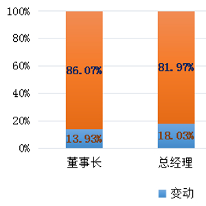 董事长和总经理是公募基金管理人的两个核心职位,二者变动的情况较少,变动原因主要是公司及股东安排。2018年,董事长没有发生变动的公募基金管理人共计105家,占比86.07%,变动一次的有16家,变动两次的有1家。总经理没有发生变动的公募基金管理人共计100家,占比81.97%,变动一次的有15家,变动两次的有7家。