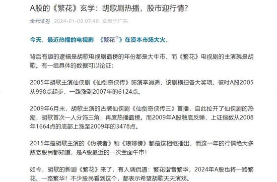 最近,坊间出现了一种近年来胡歌主演电视剧的热播,与A股市场走势之间关联的玄学推演。日前,金元证券在其微信公众号上专门发文对此展开了一番分析,认为距今最近的2015年A股大牛市的宏观环境,其实与当下有着一定程度相似。