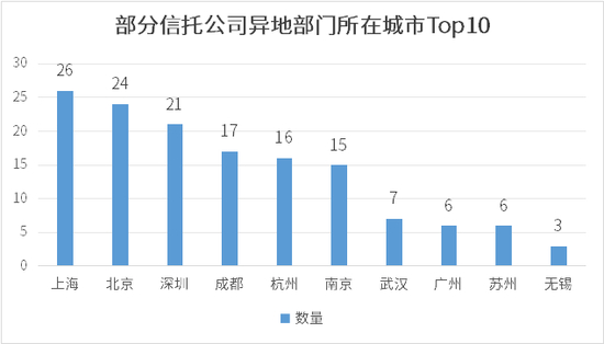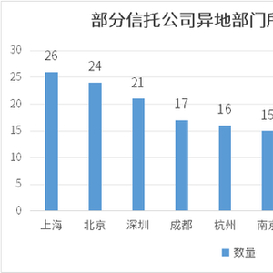 从此次统计的情况来看,北京、上海、深圳3个一线城市几乎成为信托公司的“必选”城市,此次纳入统计的32家公司中分别有26家、24家、21家选择在上述3个城市设立异地部门。另据记者了解,这些公司中有几家已申请将上海设立为异地管理总部,但因目前整改暂未全部完成,或方案未最终确定等原因暂未更新至官网。