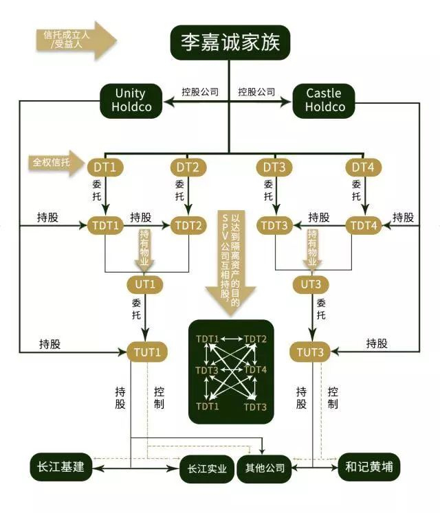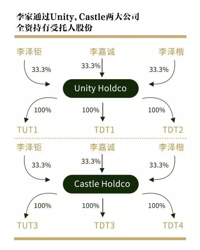 最后,在对家族信托的控制上,两个子信托和房产信托的全部已发行股份由控股公司拥有。而这间公司的全部已发行股本由李嘉诚、李泽钜及李泽楷各自拥有1/3(设立时)。