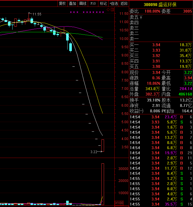 再来看看近期盛运环保的K线走势图,去年12月开始停牌,今年6月1日复牌一天一字跌停,继续停牌到7月2日复牌,又是连续一字跌停,到今日早盘封跌停为第10个跌停。