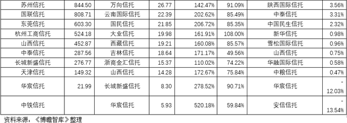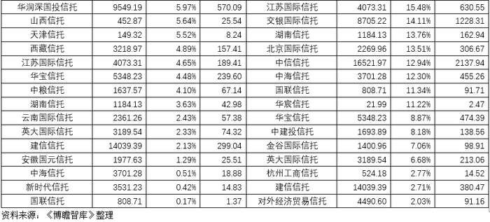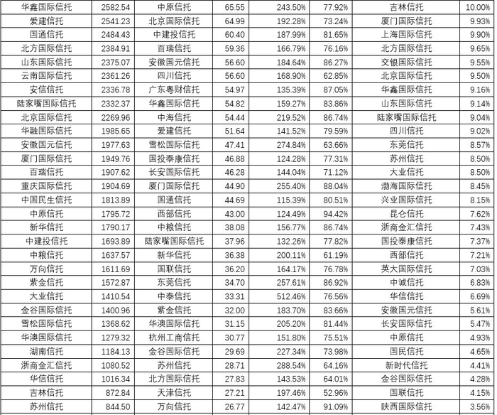 第一,这10家信托公司和比例分别为新时代信托(94.19%)、天津信托(79.28%)、山西信托(73.90%)、国民信托(72.28%)、吉林信托(69.93%)、西部信托(61.33%)、重庆国际信托(59.84%)、中泰信托(53.18%)、雪松国际信托(52.92%)、安信信托(52.46%)。