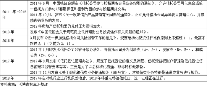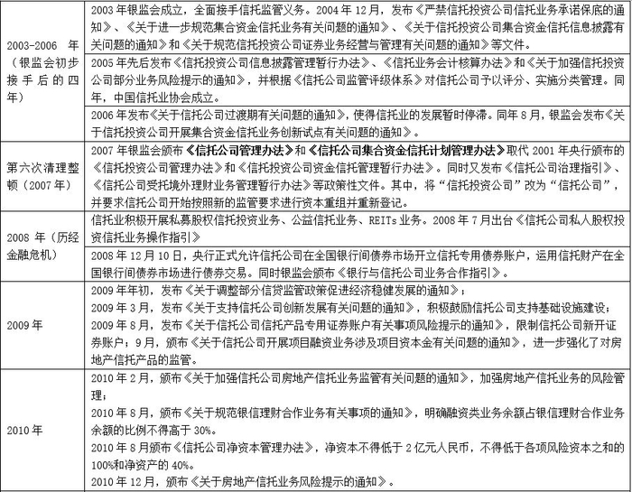 2003年银监会接手信托公司的监管权后,开始重塑监管架构。2007年银监会发布新两规(和《信托法》并称为“一法两规”),使信托公司的业务发展逐步迈入正轨,之后适逢2006-2007年的大牛市、2008年的金融危机以及2008-2009年的4万亿元刺激计划,银信合作得到空间发展,这期间由于银行信贷规模受到管控、表外业务需求急速增长的情况下,配资业务(两轮大牛市)、政信等基建业务和房地产业务(源于信贷规模管控等)、理财资金通过信托发放贷款等通道业务开始大幅发展。当然,业务在不断发展的同时,风险也隐患也明显增加。2010年以来银监会开始出台相关政策进行约束,但信托公司天然的业务优势总能为其打开新一轮的业务发展空间。当然这一银监体系内部的合作模式使得证监会和保监会艳羡不已,2012年之后证监会体系下的机构也复制信托的业务模式得以快速发展,保监会也出台相关政策放开保险资管业务。在2012-2017年的这五年时间,大资管业务为主的影子银行业务催生了各种业务类型,也导致金融强监管和去杠杆进程在2017年正式开始。