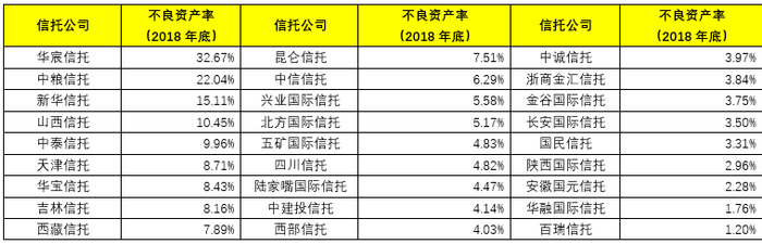 第一,4家信托公司的不良资产率在10%以上,分别为华宸信托、中粮信托、新华信托和山西信托。