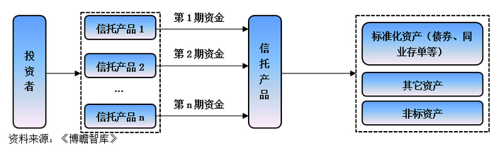 一层信托有时没办法达到监管的要求(如期限完全匹配等),因此TOT(Trust of Trust)是一种可行的方式,即通过滚动发行的多期限开放式信托产品向投资者募集资金,通过第二层信托产品投资于非标资产,即母基金和子基金的形式,通过这种方式可以达到规避监管、藏匿风险的目的,当然这种模式如果穿透的话仍然存在期限错配的问题,流动性风险不能忽视。