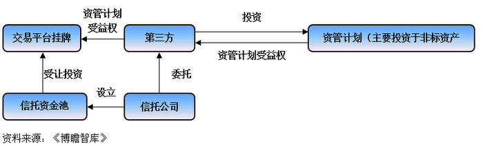 这类模式是信托公司首先委托第三方去投资一个资管计划(底层资产为非标等),再设立一个信托资金池,第三方将上述资管计划受益权在交易平台(如北金所、银登等)挂牌,信托公司通过信托资金池去摘牌,以此达到规避投资的目的。从表面上看,信托资金池投资的是标准化份额资产,但究期本质还是通过协议转让的方式完成对接,一是没有流动性,二是价值不公允,三是底层资产不清晰等等,也属于资金池业务,存在流动性风险。