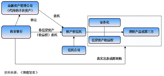 这里面其实蕴含着两种模式,第一种是商业银行将不良资产转让给资产管理公司代持,并承诺到期回购,资产管理公司将代持的不良资产委托给成立的财产权信托,形成信托收益权,由商业银行负责不良资产的处置清收工作等,并承诺回购信托收益权。其本质上是一种代持行为(即假出表、为了规避监管)。