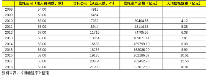 1、自2013年以来,我国信托公司数量便一直稳定在68家,从业人数目前已经超过2万人。
