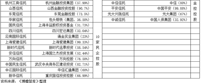 3、10家民企背景的信托公司分别为国民信托、四川信托、云南国际信托、爱建信托、新时代信托、安信信托、万向信托、民生信托、中江国际信托、新华信托。