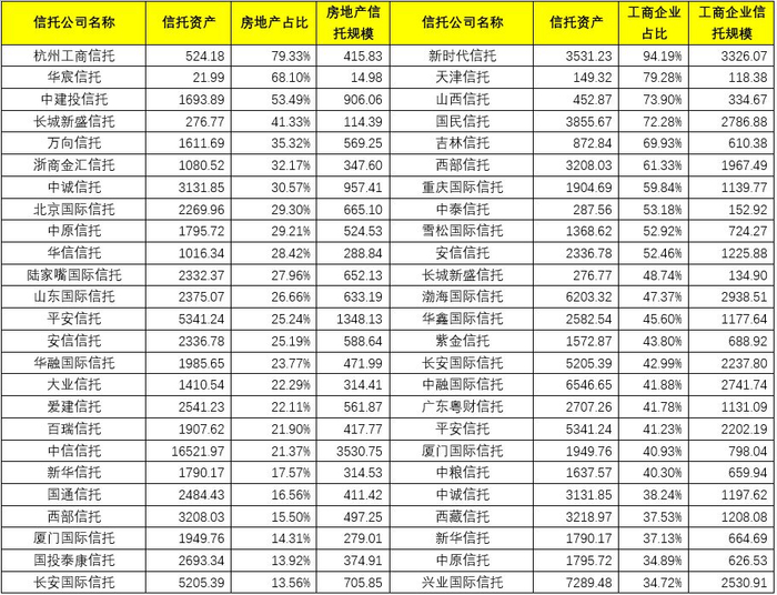 第二,12家信托公司和投向房地产的比例分别为北京国际信托(29.30%)、中原信托(29.21%)、华信信托(28.42%)、陆家嘴国际信托(27.96%)、山东国际信托(26.66%)、平安信托(25.24%)、安信信托(25.19%)、华融国际信托(23.77%)、大业信托(22.29%)、爱建信托(22.11%)、百瑞信托(21.90%)、中信信托(21.37%)。