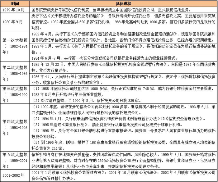(二)但正是由于这种所谓的“全牌照”优势,使得信托行业乱象一再丛生,2000年之前的五次整顿,2000年之后的两次整顿(包括本次),金融乱象在信托行业中可谓是体现得最为明显。