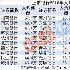 那么银行业的薪资待遇究竟如何呢?Wind数据显示,近年来,上市银行的人均薪酬呈现上涨趋势。从人均薪酬的平均数来看,上市银行2018年人均薪酬为32.83万元。其中,招商银行以人均57.71万元遥遥领先,而排名前十的银行均为股份制银行和城商行,工商银行、农业银行、中国银行、建设银行、交通银行五大银行的人均薪酬则相对逊色,分别为26.95万元、26.10万元、27.57万元和29.60万元和32.99万元。