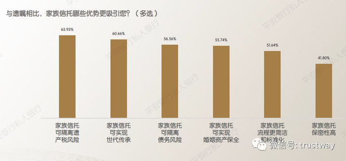 通过比较“家族信托”与“遗嘱”,平安银行在调研中发现,超过6成的人群认为家族信托的最大优势是“可隔离遗产税风险”,其次为“家族信托可实现世代传承”及“家族信托可隔离债务风险”。