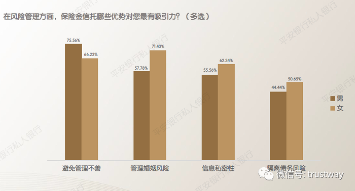 调研发现,高净值人群最认可的保险金信托优势为“避免管理不善”和“管理婚姻风险”,超6成的人群选择了这两项。由此可见,在财富传承中,除资产配置这类常规的需求外,高净值人群首要关注的是风险隔离,其次是如何传承。