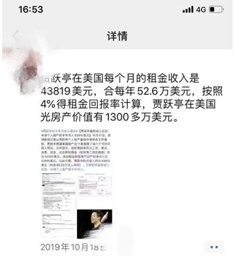 有吃瓜网友给他算了笔账,30万一个月,一年360万,按4%的租金回报率,贾跃亭在美国,有价值9000万元的房产。