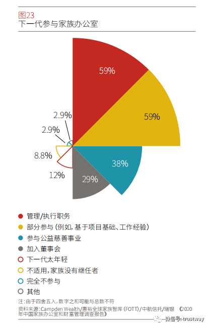 近五分之三(59%)的家族表示下一代会担任管理/执行职务,而29%的家族表示他们会担任董事。59%的家族表示,下一代会在一定程度上参与业务,例如基于项目基准或获得工作经验,而只有2.9%的受访者表示他们根本没有参与业务。