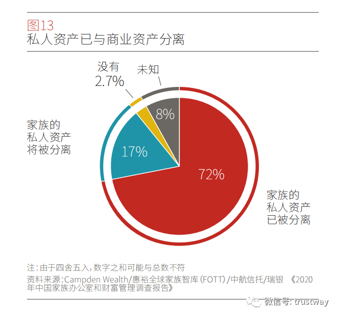 报告显示,几乎90%的受访者表示,家族的私人资产目前已与其商业资产分离(72%)或未来将会分离(17%),表明中国的财富管理比想象中的要发达。
