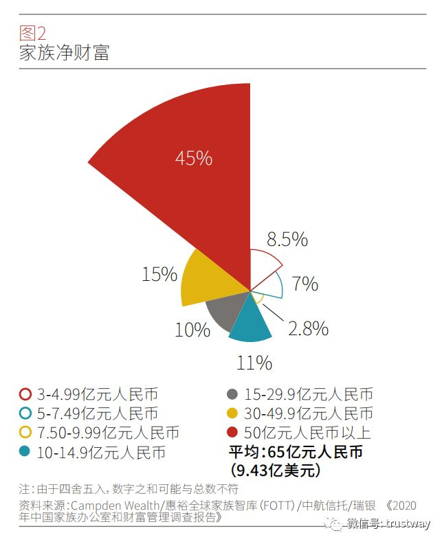 根据中航信托与UBS瑞银集团联合推出的《2020家族财富和家族办公室调研报告》,参与调查家族的平均净财富约为65亿元人民币(约合9.43亿美元),有45%的家族净财富超过50亿元人民币,家族办公室的平均管理资产规模为42亿元人民币,约占比65%,低于76%的全球水平。